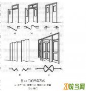 房間門按開啟方式的不同,常見的有平開門(分內開和外開;單扇、雙扇 和多扇)、彈簧門(分單向及雙向,門扇應為半玻璃或全玻璃,以免進出時相互 碰撞)、推拉門(分單扇和雙扇;上掛式和下滑式,門扇高度小于 4m 時用上掛 式,大于 4m 時用下滑式)、折疊門...